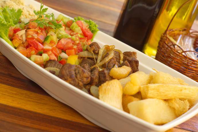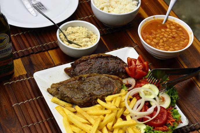 Tiras de Filé Mignon acebolado, servidas com batata frita.