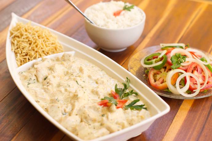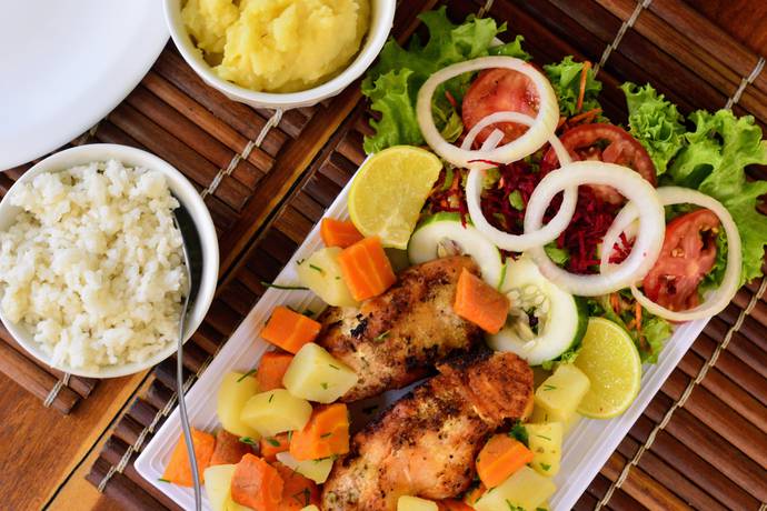 Arroz, salada, legumes e purê de batata.
