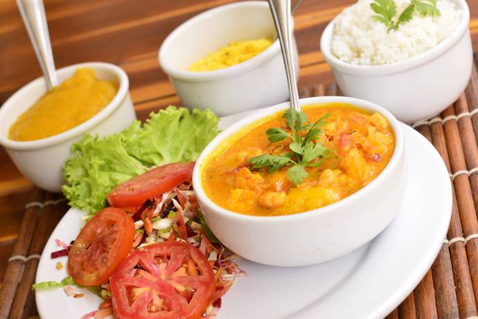 Moqueca é cozida no molho cremoso feito com azeite de dendê, leite de coco, creme de leite, tomate, cebola e pimentão e no final acrescentado o siri.